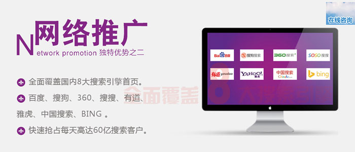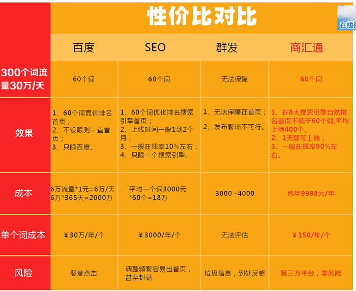 1、網(wǎng)絡營銷成為新時代的寵兒!互聯(lián)網(wǎng)的發(fā)展,讓越來越多的人開始重視并選擇網(wǎng)絡營銷推廣!網(wǎng)絡營銷大大改變了企業(yè)的營銷方式! 二.企業(yè)網(wǎng)站宣傳推廣新助手-商匯通 "商匯通"是國內(nèi)首家專注于搜索引擎首頁精準營銷的電子商務云銷平臺,整合公司8年技術(shù)積累和優(yōu)秀合作平臺,幫助客戶實現(xiàn)成百上千個精準關鍵詞自然排名8大搜索引擎首頁,方便、快捷、穩(wěn)定實現(xiàn)企業(yè)搜索引擎推廣。 三.選擇我們的十大理由 1、五大搜索引擎首頁排名推廣!