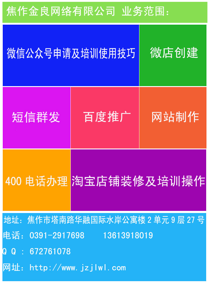 最新公告: 網(wǎng)站建設(shè)|百度推廣|400免費電話|手機網(wǎng)站|短信群發(fā)|微信平臺|谷歌推廣|企業(yè)APP定制開發(fā)|淘寶店鋪裝修設(shè)計,電話:13613918019 0391-2917698